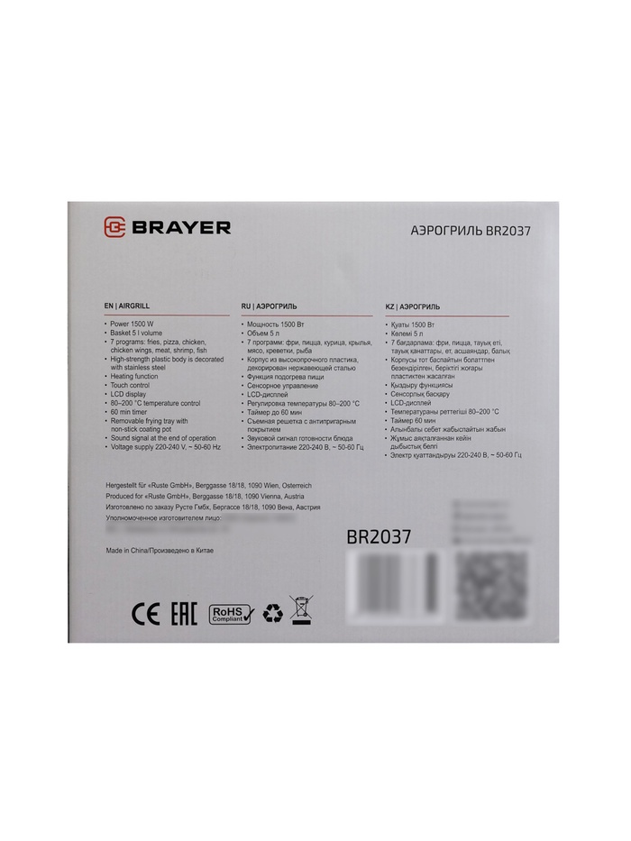Технические характеристики Аэрогриль BRAYER 2037BR, 1500 Вт, 5 л, 7 программ, 200°С, LCD-дисплей, таймер, решётка, чёрно-серый