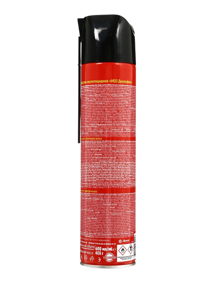 Аэрозоль от насекомых «Дихлофос НЕО» - это мощное средство для быстрого уничтожения тараканов, муравьев, клопов, блох, мух, комаров, ос и других насекомых. Действующее вещество тетраметрин обладает нокдаун-эффектом - вредители погибают в течение нескольких секунд после контакта с аэрозольным облаком. Большого баллона 600 см³ достаточно для обработки нескольких помещений или квартиры целиком.