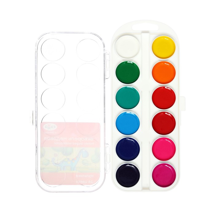 Технические характеристики Акварель 24 цвета, «Гамма» «Мультики», без кисти, в пластиковой коробке