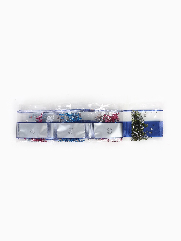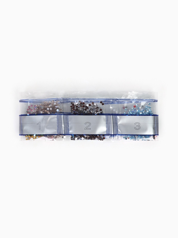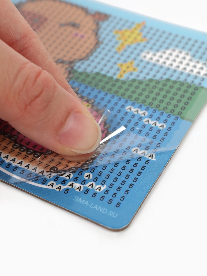 Ребёнку предстоит разложить кристаллики карандашом по пронумерованной схеме, заполнив всё полотно. Основа с клеевым покрытием будет надёжно удерживать стразы. На ней уже обозначены необходимые оттенки.