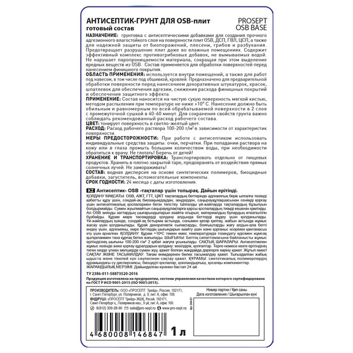 Антисептик-грунт для OSB-плит PROSEPT OSB BASE, 1 л