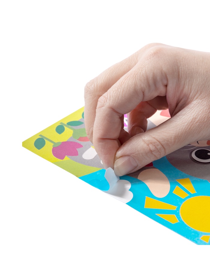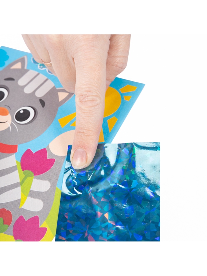 Ребёнку нужно аккуратно снимать защитный слой с отдельных элементов рисунка и прикладывать к ним цветную фольгу. В результате получается сияющая аппликация с эффектом металлика.