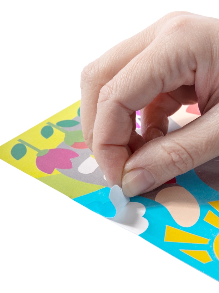 Ребёнку нужно аккуратно снимать защитный слой с отдельных элементов рисунка и прикладывать к ним цветную фольгу. В результате получается сияющая аппликация с эффектом металлика.