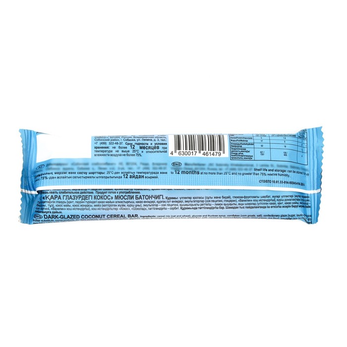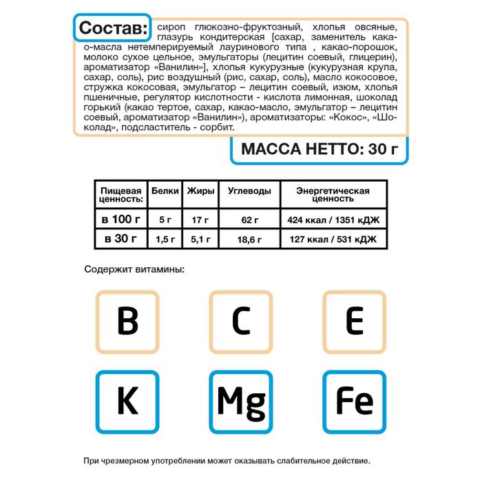 Состав: сироп глюкозно-фруктозный, хлопья овсяные, глазурь кондитерская (сахар, заменитель какао-масла нетемперируемый лауринового типа , какао-порошок, молоко сухое цельное, эмульгаторы (лецитин соевый, глицерин), ароматизатор «Ванилин»), хлопья кукурузные (кукурузная крупа, сахар, соль), рис воздушный (рис, сахар, соль), масло кокосовое, стружка кокосовая, эмульгатор – лецитин соевый, изюм, хлопья пшеничные, регулятор кислотности - кислота лимонная, шоколад горький (какао тертое, сахар, какао-масло, эмульгатор – лецитин соевый, ароматизатор «Ванилин»), ароматизаторы: «Кокос», «Шоколад», подсластитель - сорбит.
