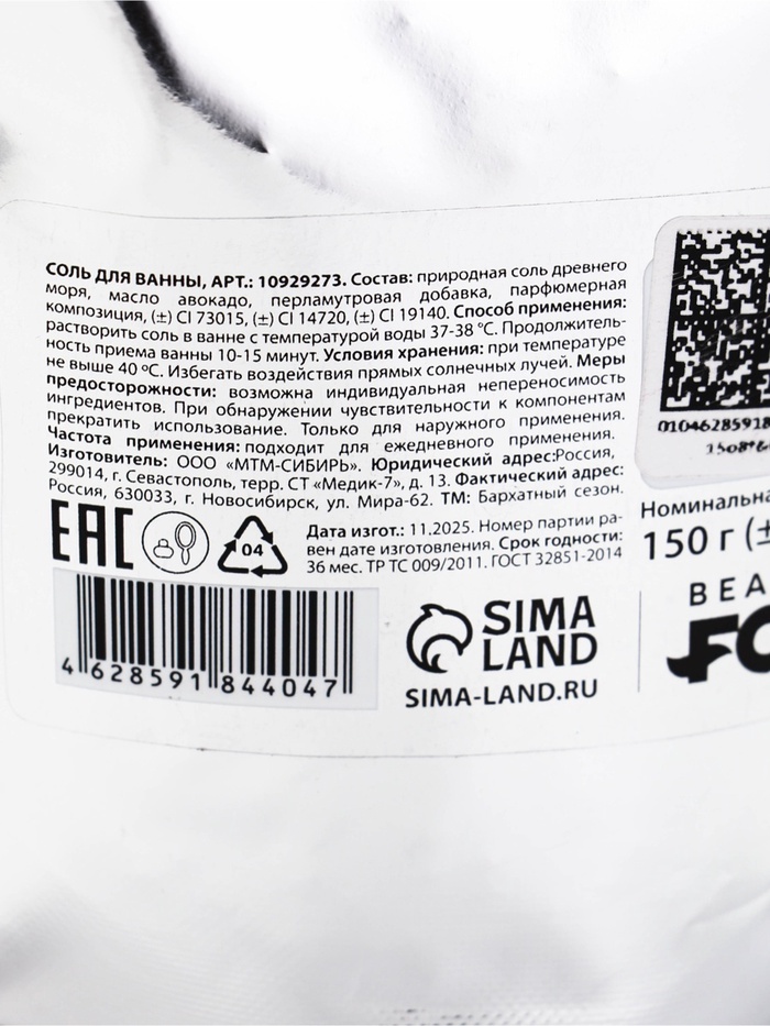 Технические характеристики Соль для ванны «Соленая, как слезы бывших», 150 г, с ароматом малины