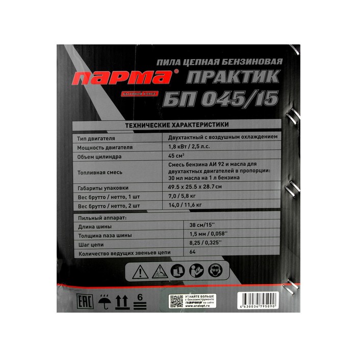 Технические характеристики Бензопила «ПАРМА» БП 045/15, 2Т, 1.8 кВт, 2.5 л.с., 15«, шаг 0.325», 64 зв.