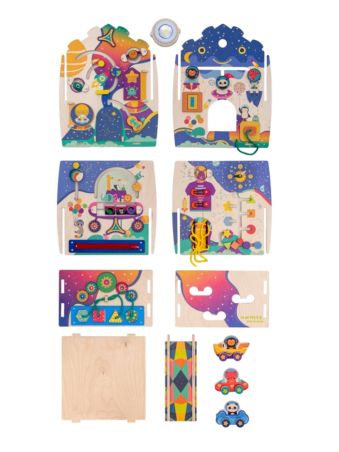 | Состав бизиборда | Выключатель; Лабиринт; Молния; Пуговицы; Розетка; Сортер; Часы; Шестерёнки; Шнуровка |