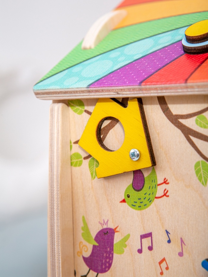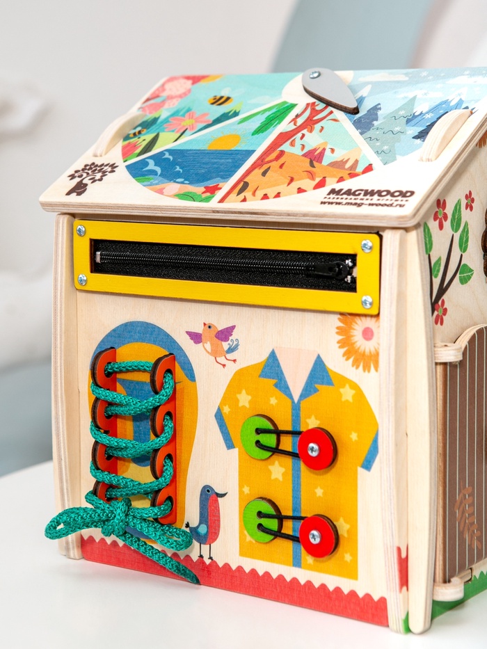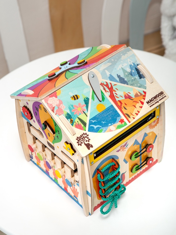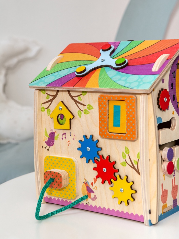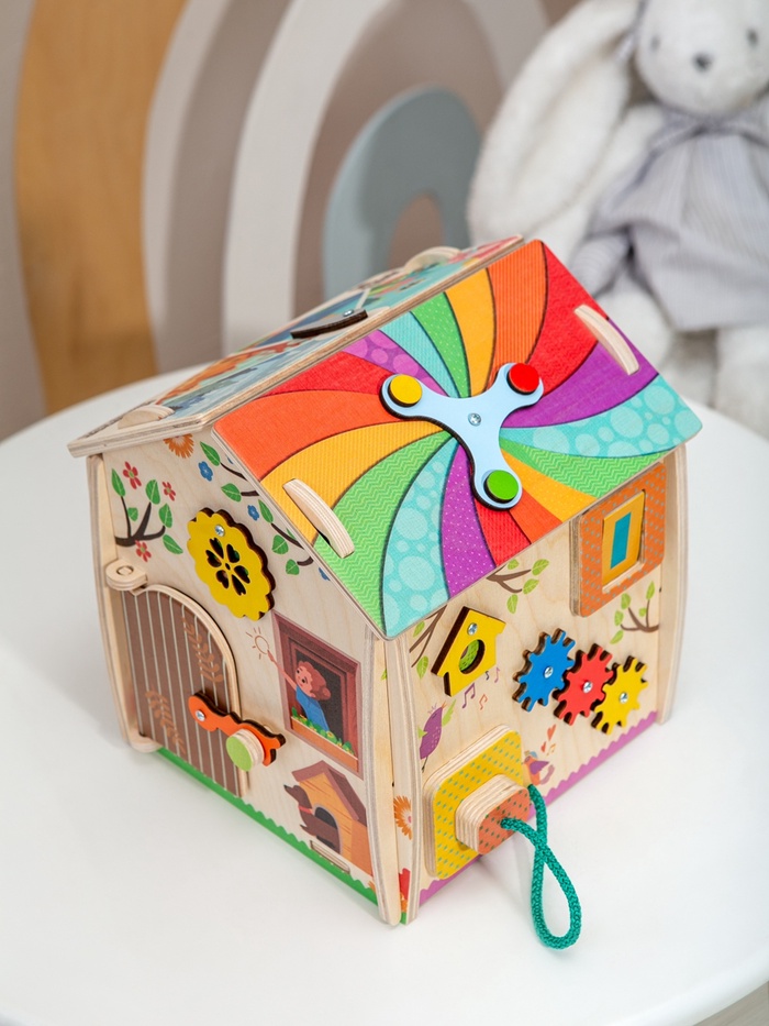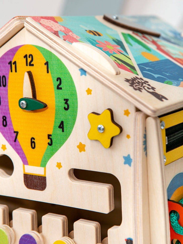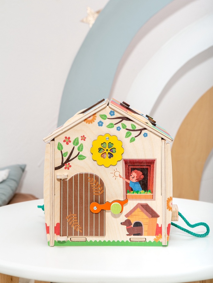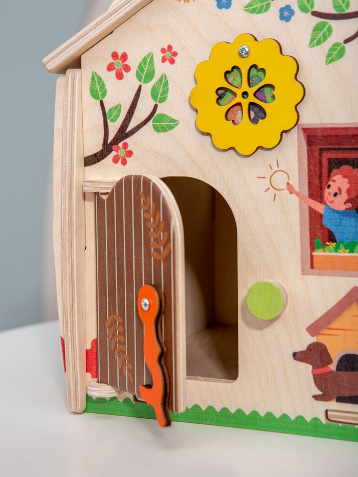 Дом, где каждая сторона приглашает к игре. Деревянный развивающий бизидом «Весенний домик» — это игровой центр для детей, в котором привычные бытовые элементы превращаются в увлекательные задания. Ребенок исследует детали, вращает механизмы, открывает и закрывает замочки, постепенно знакомясь с миром предметов через игру и движение.