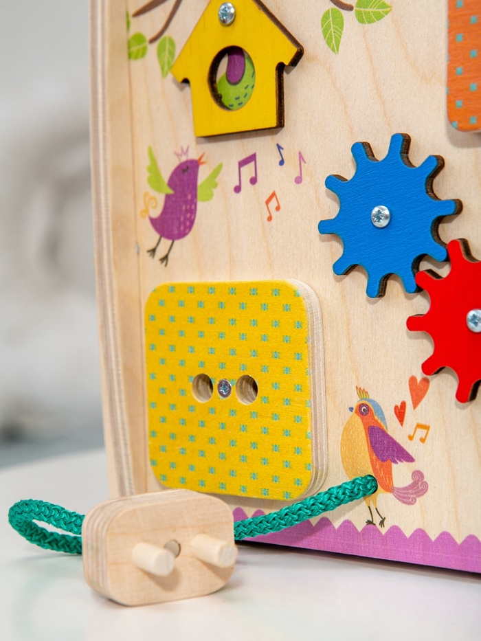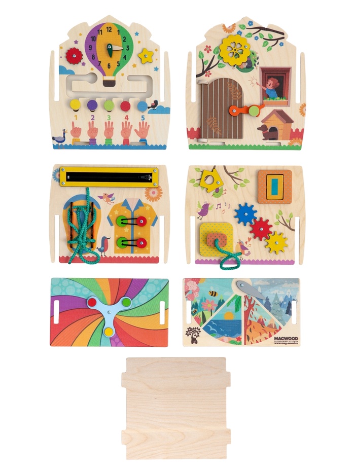 | Состав бизиборда | Колесико; Лабиринт; Молния; Розетка; Часы; Шестерёнки; Шнуровка; Щеколда |