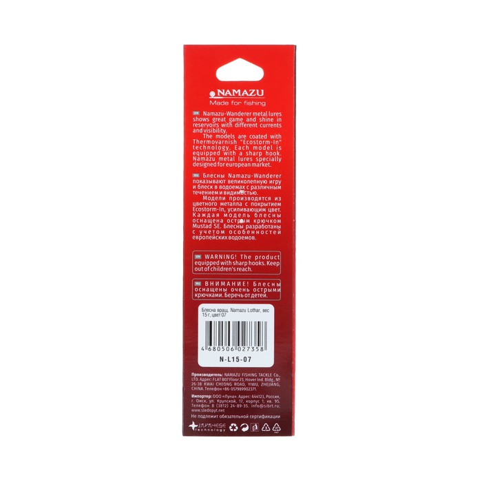 Технические характеристики Блесна вращающаяся Namazu Lothar, 15 г, цвет 07