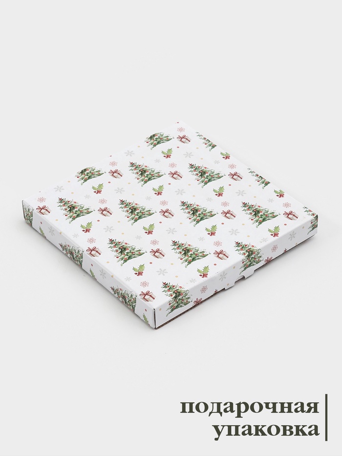 - Бело-зелёная праздничная палитра: цвета передают атмосферу хвойного леса под снегом. Рисунок лаконичен, не перегружает поверхность и оставляет достаточно места для угощений.