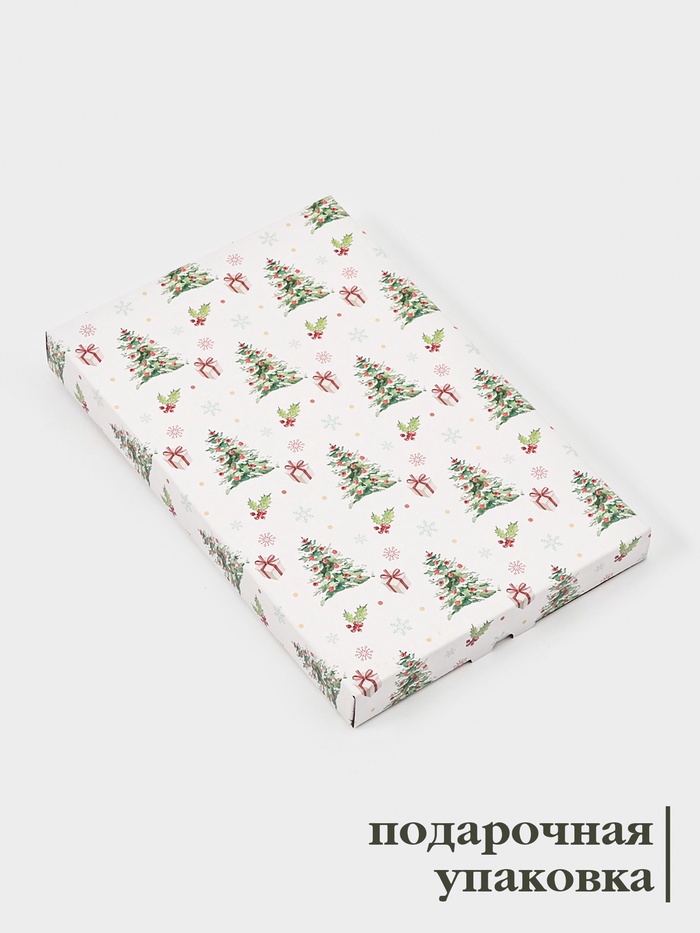 - Новогодний узор: дизайн вдохновлён зимним лесом — тонкие ветви ели в бело-зелёной гамме. Рисунок не вычурный, но сразу задаёт праздничное настроение, особенно в сочетании с деревянной посудой или льняным текстилем.