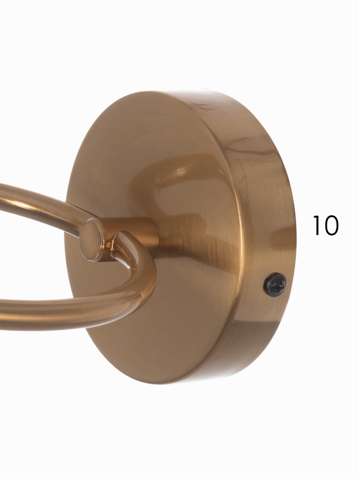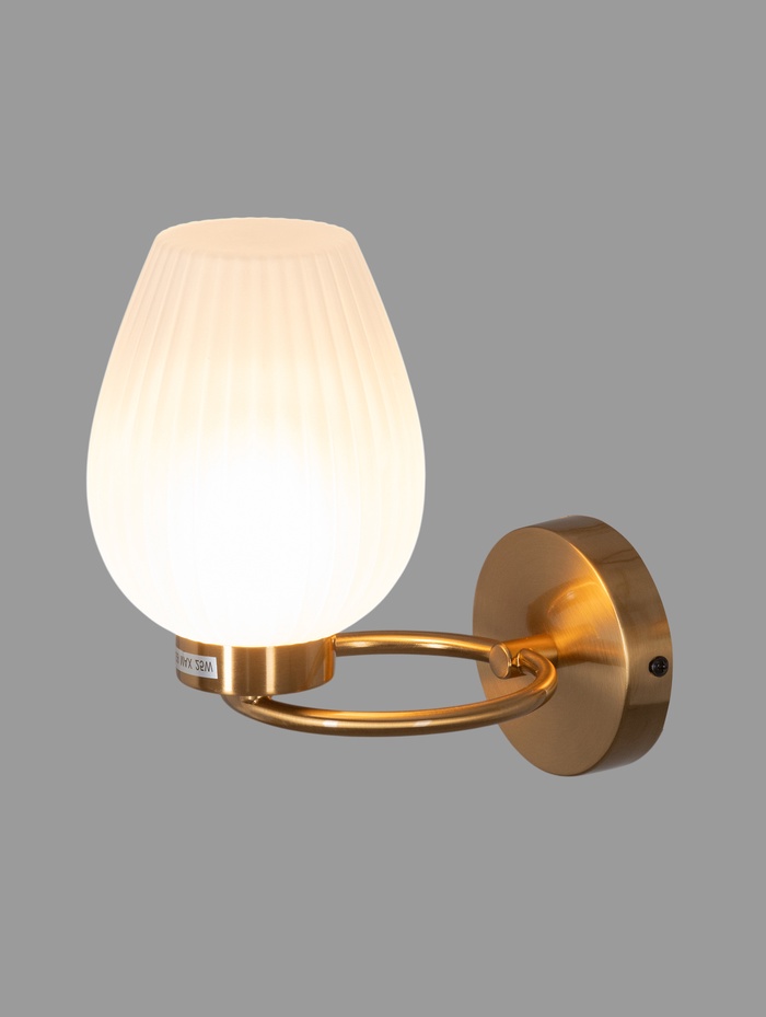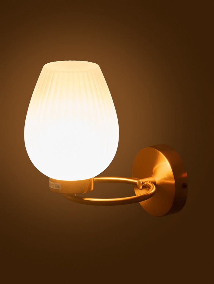 Настенный светильник с латунным металлическим основанием и белым плафоном сочетает современный дизайн и функциональность. Тёплый цвет основания создаёт атмосферу уюта, а мягкий свет плафона гармонично дополняет интерьер, делая пространство визуально выразительным и комфортным для глаз.
