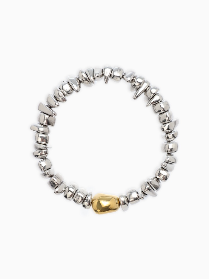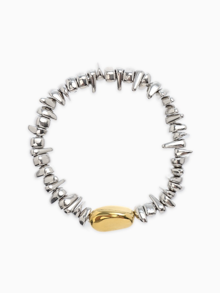 Его главная особенность — сочетание двух благородных оттенков: серебристого и золотистого. Эти тона придают изделию особую выразительность, подчеркивая его уникальность и привлекая восхищенные взгляды окружающих. Декоративная деталь выполнена в каменном стиле, имитируя природные минералы, что добавляет нотку природной гармонии и спокойствия.