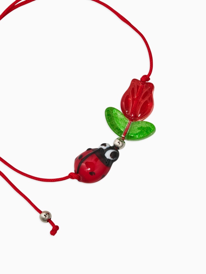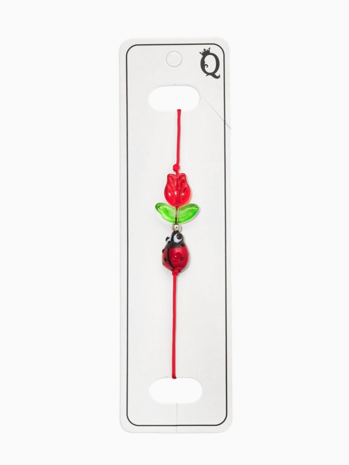 Браслет-оберег «Красная нить» тюльпан с божей коровкой, цвет красно-зелёный