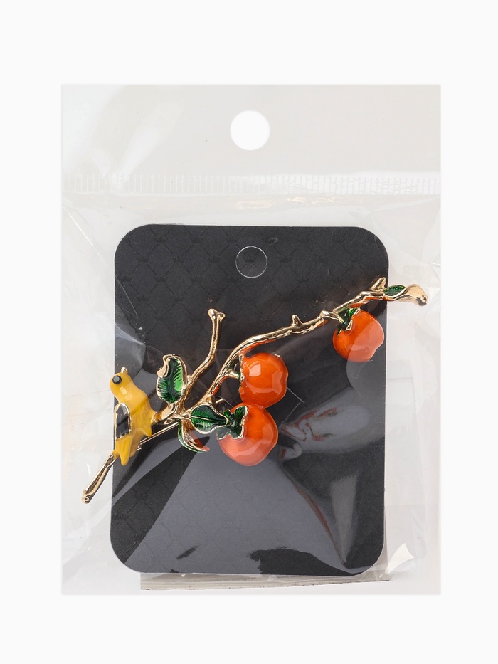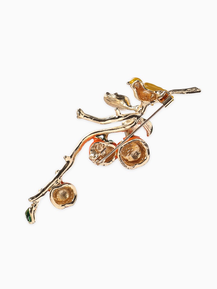 Брошь «Птица на ветке с хурмой», оранжевая в золоте