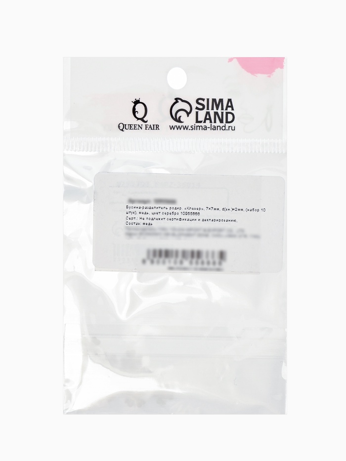 Бусина-разделитель родир. «Клевер», 7×7мм, d(вн.)=2мм, (набор 10 штук), медь, цвет серебро