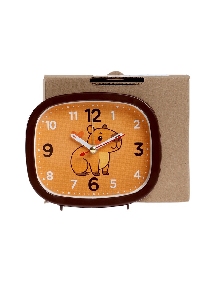 Этот будильник сочетает в себе функциональность и оригинальный дизайн с изображением милой капибары, который оживит интерьер и подарит приятные эмоции с самого утра. Коричневый прямоугольный корпус гармонично вписывается в классические и современные интерьеры, а яркий оранжевый циферблат с чёткими цифрами и забавным мотивом капибары обеспечивает отличную читаемость времени в любое время суток. Плавный ход стрелок исключает раздражающие тиканья, создавая спокойную атмосферу даже в спальне.