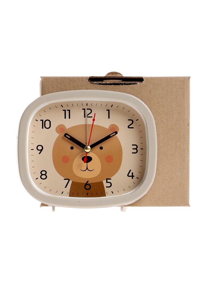 Бежевый будильник с плавным ходом стрелок — это уютный элемент декора, который добавит тепла и гармонии в вашу спальню или детскую. Прямоугольный корпус размером 12.5×10.5 см в нежном бежевом тоне создаёт ощущение спокойствия и комфорта, идеально вписываясь в интерьеры с натуральными оттенками. Кварцевый механизм обеспечивает высокую точность, а плавное движение стрелок минимизирует шум, способствуя мягкому и приятному пробуждению. Бежевый циферблат с изображением милого медвежонка привносит нотку нежности и детской радости, превращая будильник в источник позитивных эмоций.