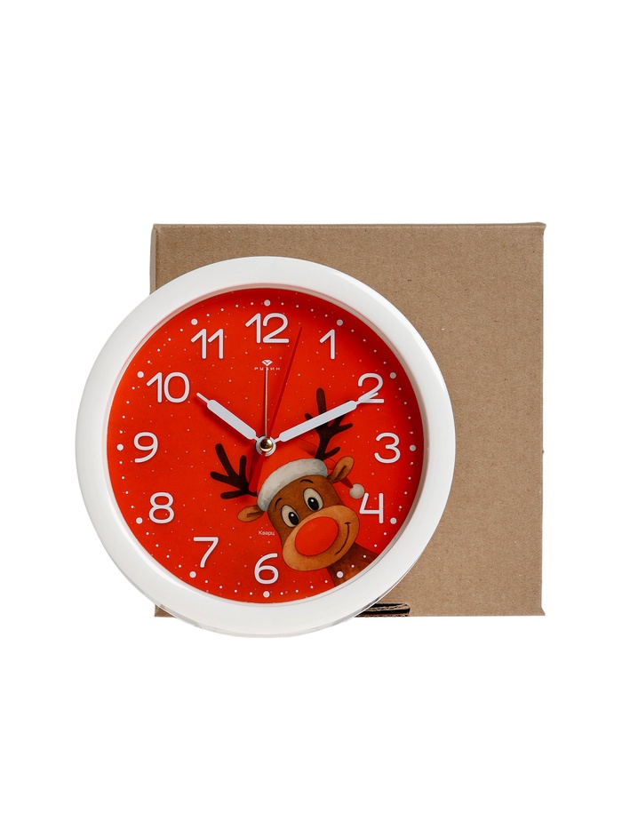 Будильник «Новогодний олень», плавный ход, d=15 см, красный, корпус белый