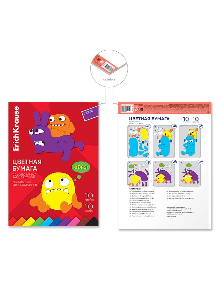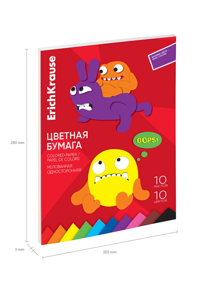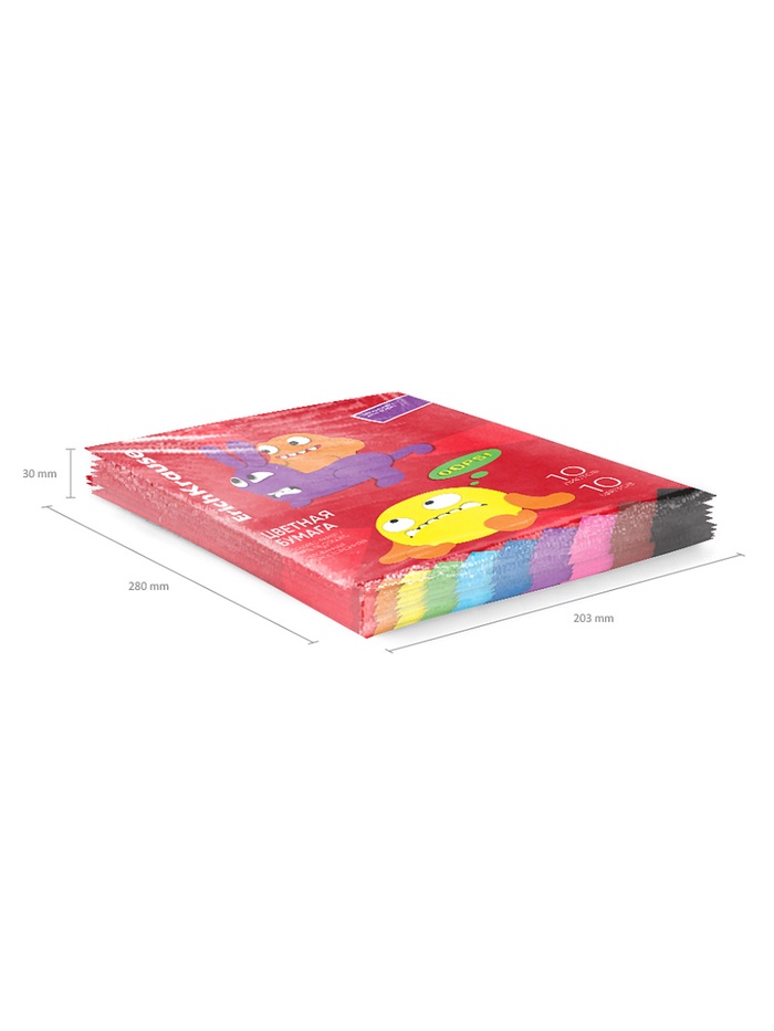 Цветная бумага мелованная односторонняя формата А4 (203х280 мм). В наборе 10 листов 10 базовых цветов (красный, оранжевый, желтый, зеленый, голубой, синий, фиолетовый, розовый, коричневый, черный). Плотность наполнения — 80 г/м2. Тип скрепления — клей. На внутренней стороне обложки приводятся инструкции по изготовлению поделок. Упакована в термоусадочную пленку по 10 штук.