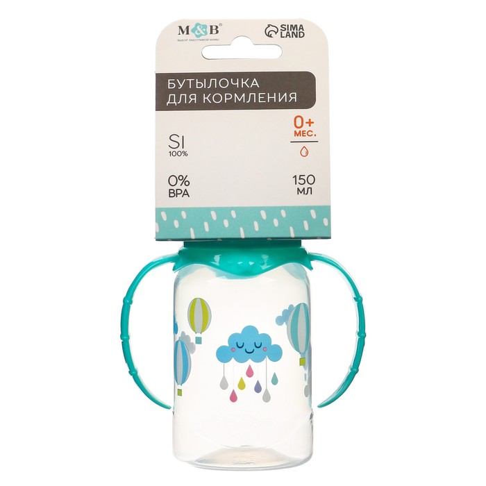 Бутылочка для кормления «Нежное облачко», классическое горло, с ручками, 150 мл., от 0 мес., цвет бирюзовый