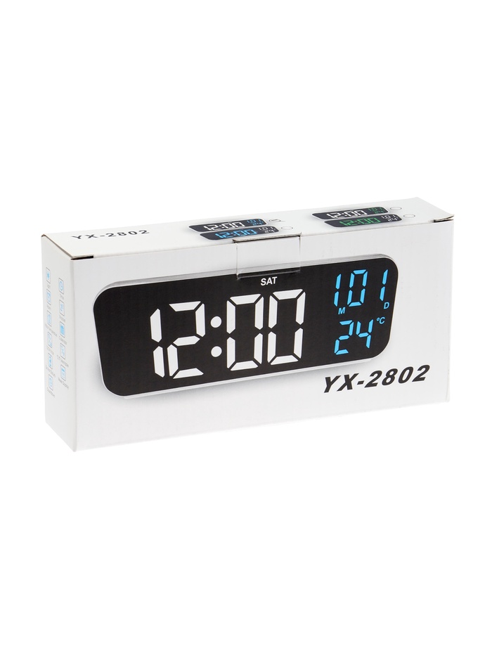 Электронные настольные часы-будильник с прямоугольной формой в белом и чёрном корпусе, питающиеся от USB, оснащены синей индикацией и встроенными функциями календаря, термометра, а также таймером, превращая устройство в компактный центр для отслеживания времени, погоды и отдыха.