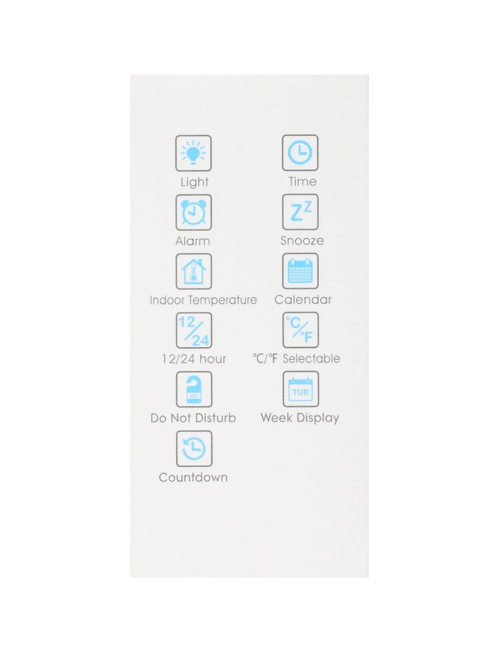 Компактный дизайн с белым и чёрным сочетанием гармонично вписывается в современные интерьеры, где синяя подсветка дополняет календарь для планирования дней, термометр для контроля климата и таймер сна для комфортного засыпания — идеально для рабочего стола или спальни.
