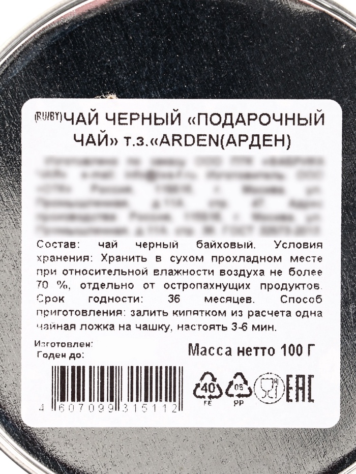 Технические характеристики Чай чёрный подарочный новогодний «Байховый. Арден», 100 г