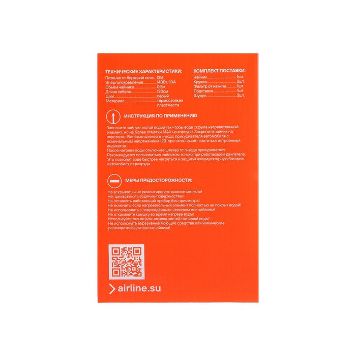 Технические характеристики Чайник автомобильный Airline, 12 В, серый пластик