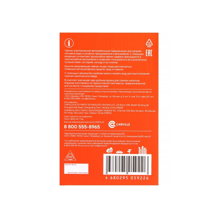 Автомобильный электрический чайник 12В, 800 мл AIRLINE позволяет нагреть воду для приготовления чая, кофе или приготовления пищи. Идеально подходит для длительных поездок на отдых или в командировку на автомобиле. Благодаря специальной подставке прибор просто и надежно фиксируется в любом удобном для водителя и пассажиров месте.