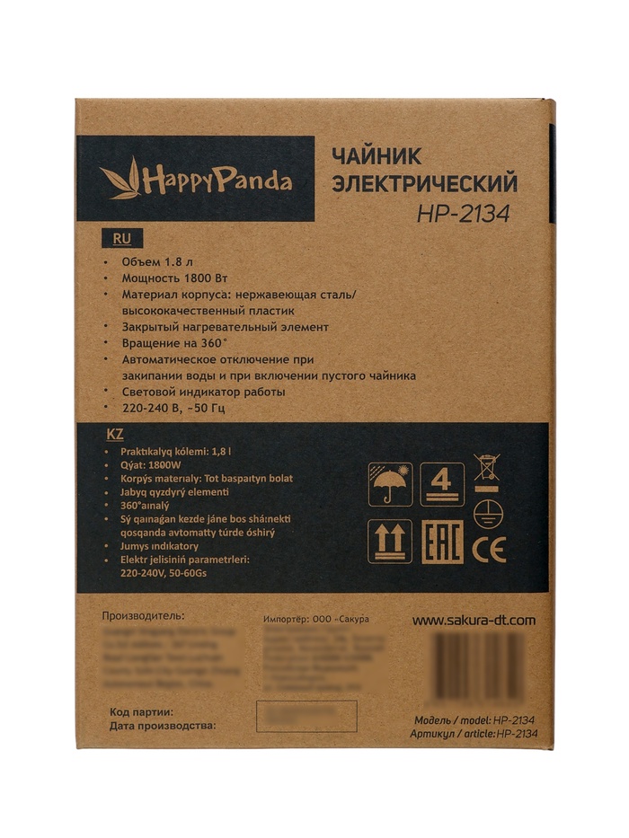 Электрический чайник SAKURA Happy panda HP‑2134 объёмом 1,8 л и мощностью 1800 Вт быстро доводит воду до кипения. Корпус из нержавеющей стали с пластиковыми элементами сочетает прочность и стильный внешний вид. Закрытый дисковый нагревательный элемент обеспечивает безопасное и эффективное кипячение.