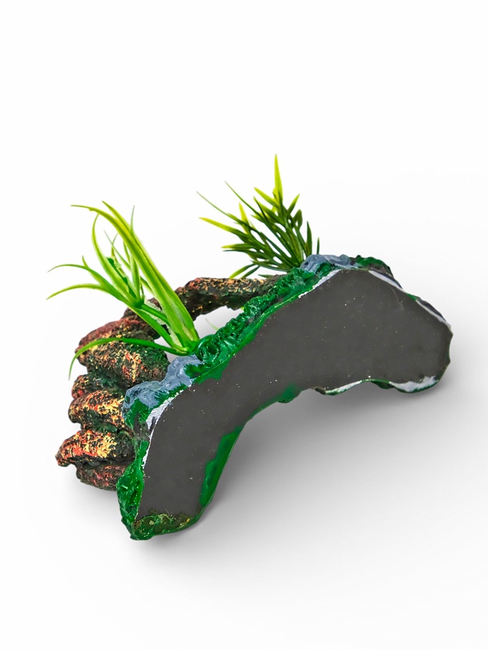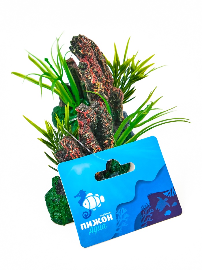 - Натуральная эстетика: декорация воспроизводит структуру пористых камней, покрытых мхом. Зеленый оттенок создает иллюзию старого, заросшего водорослями утеса, гармонично сочетаясь с живыми растениями и темным грунтом.