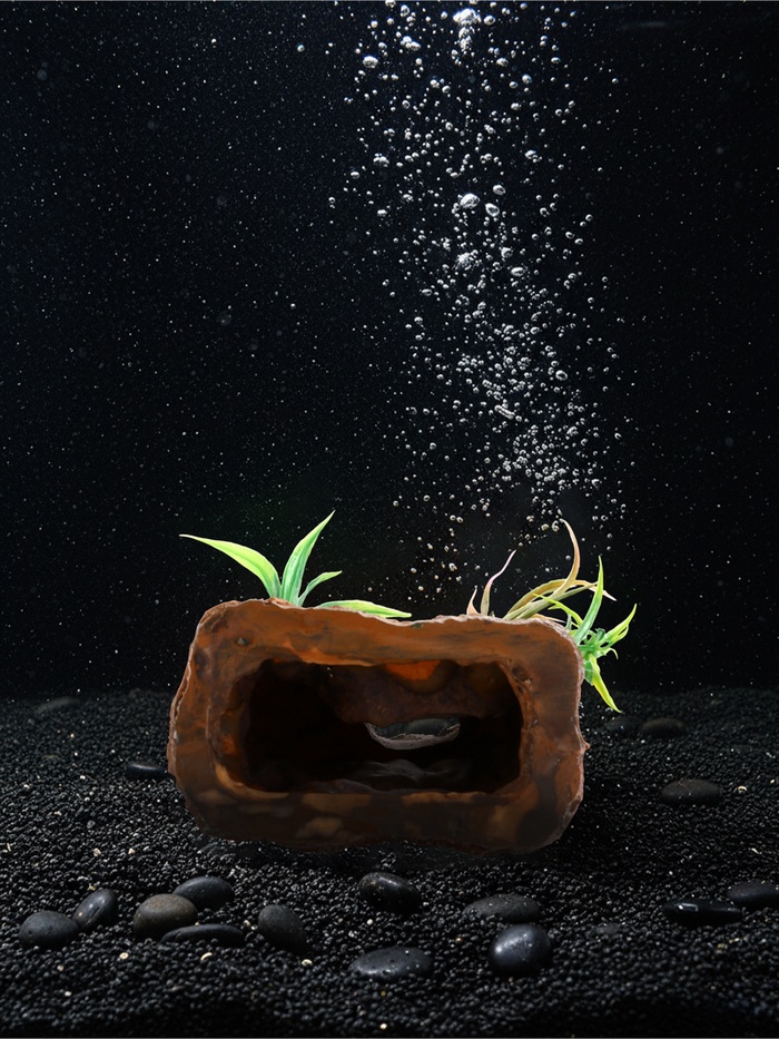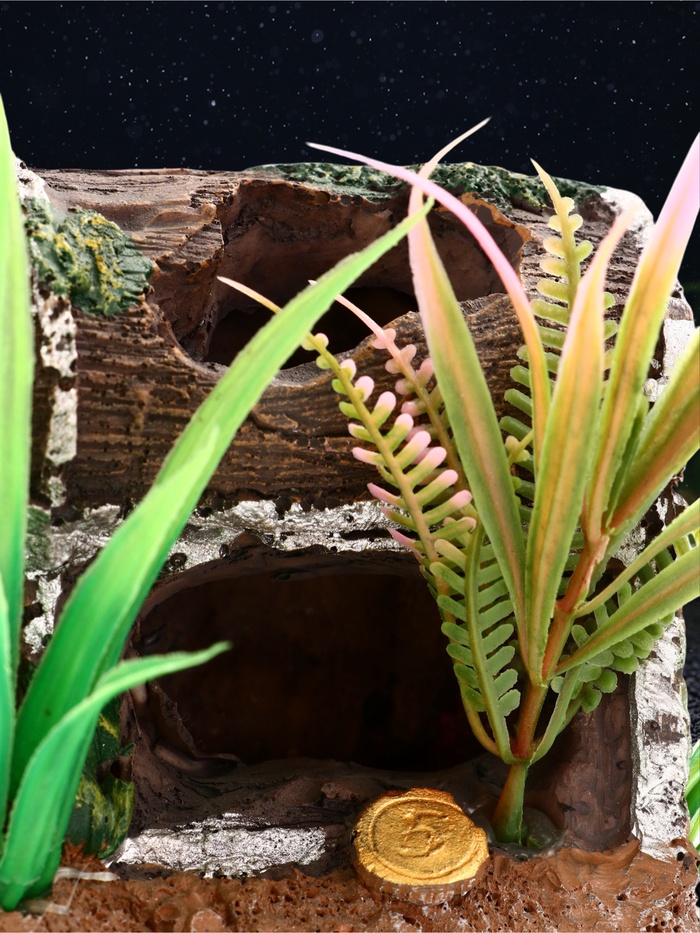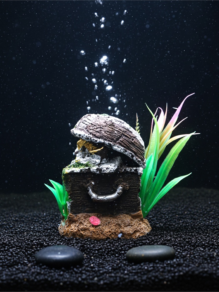 Там, где начинается подводное приключение. Аквариумный декор в форме сундука — это не просто украшение, а центральный элемент подводного сюжета. Коричневый оттенок и фактура камня делают его похожим на затонувшее сокровище, застывшее на дне среди водорослей и песка.