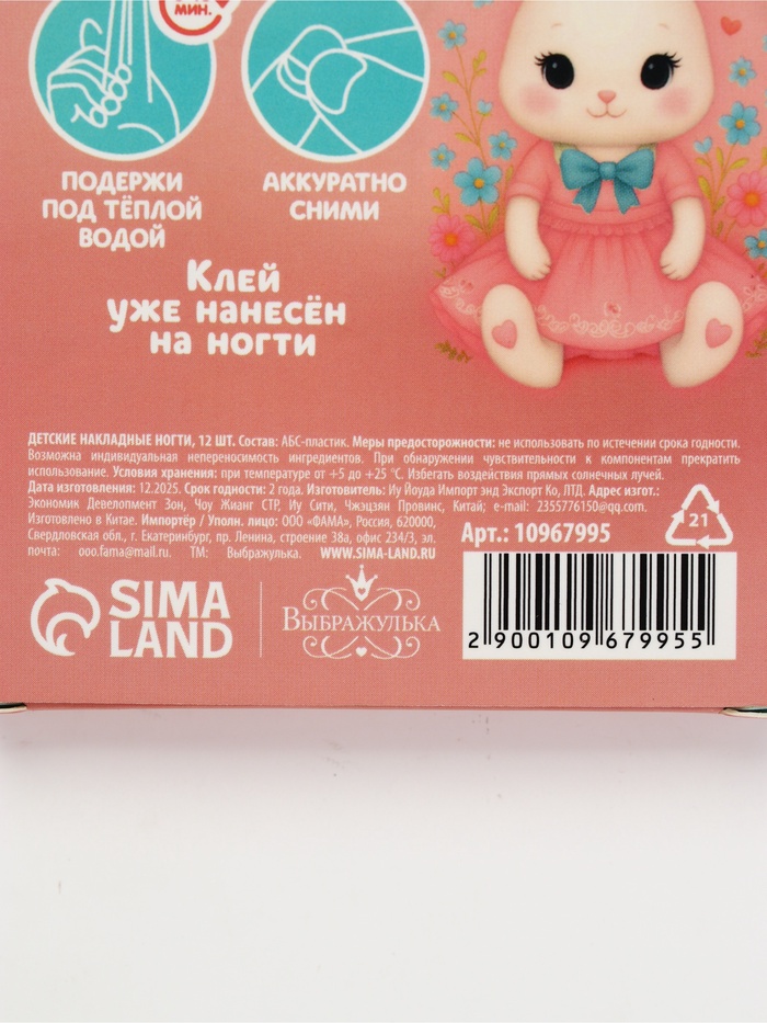 Технические характеристики Детские накладные ногти «Плюшевый зайка», 12 шт.
