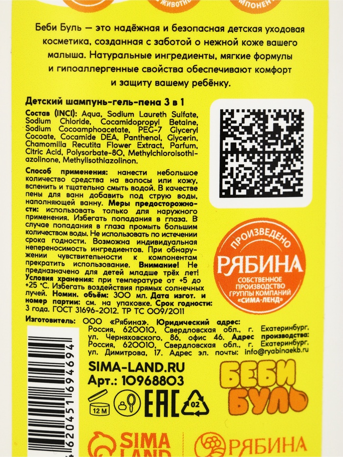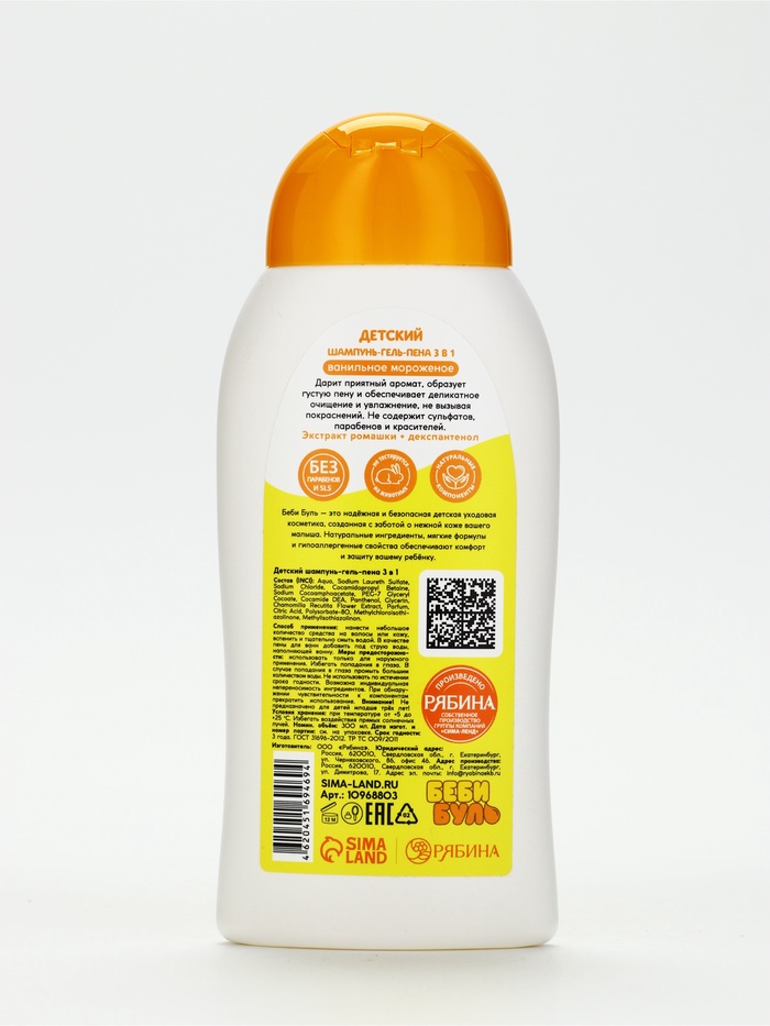 Технические характеристики Детский шампунь-гель-пена 3в1 "Беби Буль", 300 мл, аромат ванильное мороженое
