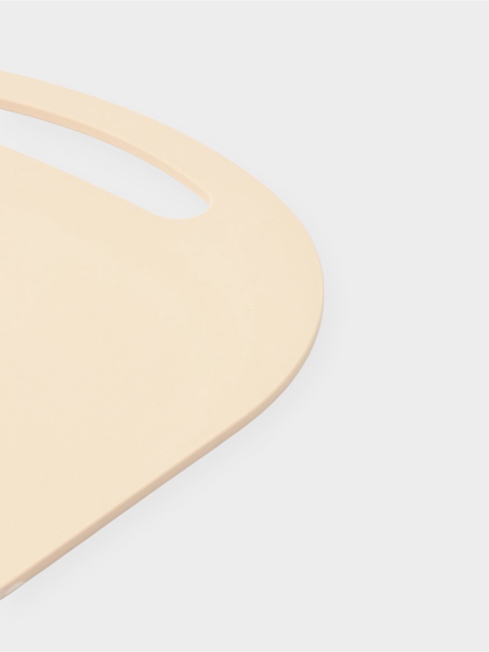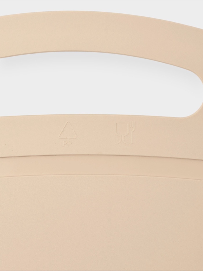 Бежевая доска для нарезки делает подготовку продуктов спокойнее. Овальная форма предоставляет простор для работы с разными ингредиентами. Желобок по краю собирает сок от мяса или фруктов, поэтому столешница остаётся сухой. Гладкая поверхность не впитывает запахи и легко очищается.