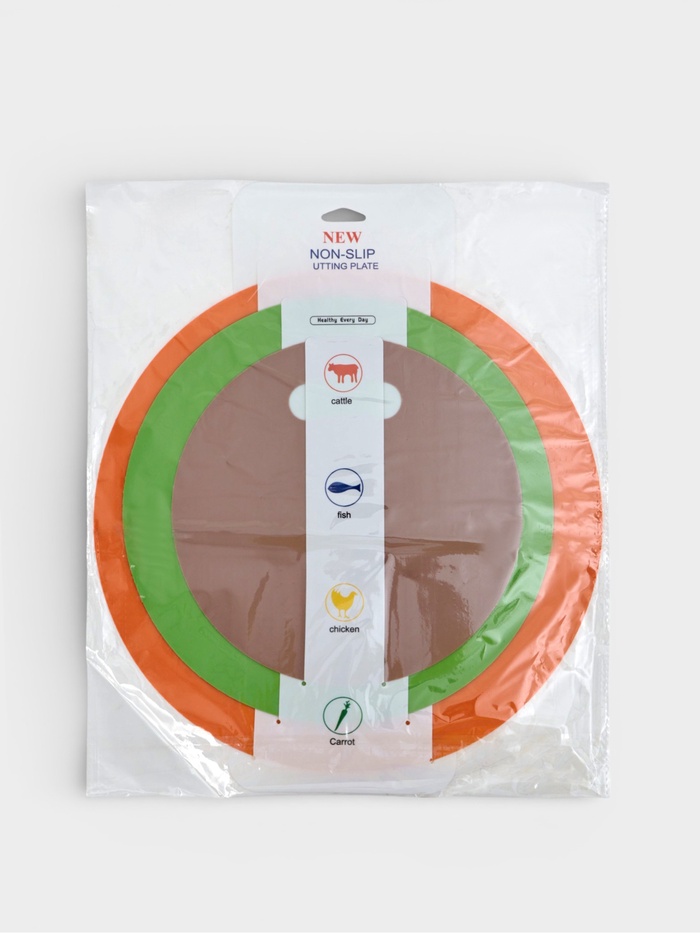 Набор гибких досок упрощает нарезку и пересыпку без лишних движений. Три круглых доски разного размера — от небольшой для лимона до крупной для батона — сгибаются краями, превращаясь в лопатку: нарезали овощи, согнули бортики, высыпали в сковороду. Оранжевая, зелёная и коричневая поверхности помогают разделить продукты по типу — никаких перекрёстных запахов и беготни за новой доской. После работы повесили на крючок у раковины или убрали в узкую щель между полками.