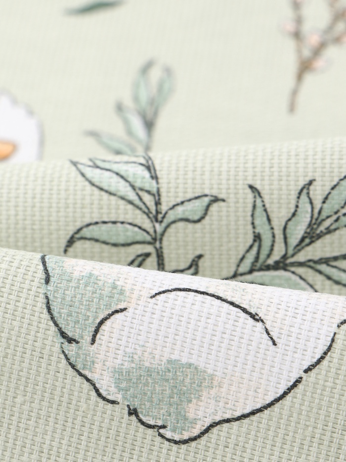 - Сочный зелёный фон с цветочно-растительным орнаментом и птицами создаёт жизнерадостное настроение.