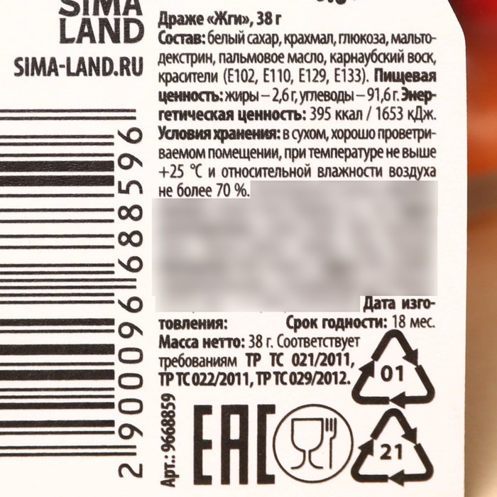 Состав: белый сахар, крахмал, глюкоза, мальтодекстрин, пальмовое масло, карнаубский воск, красители (Е102, Е110, Е129, Е133).