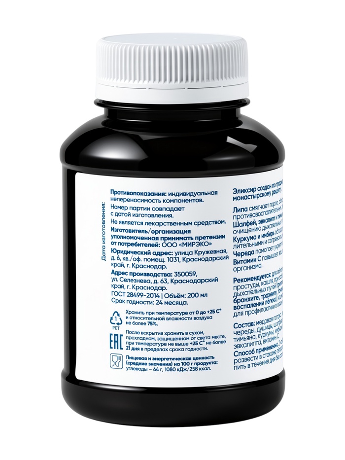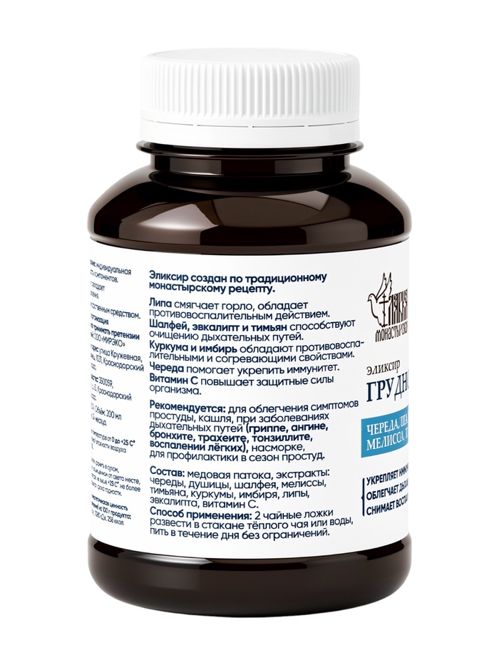 Технические характеристики Эликсир грудной «Монастырская лавка», пластик, 200 мл