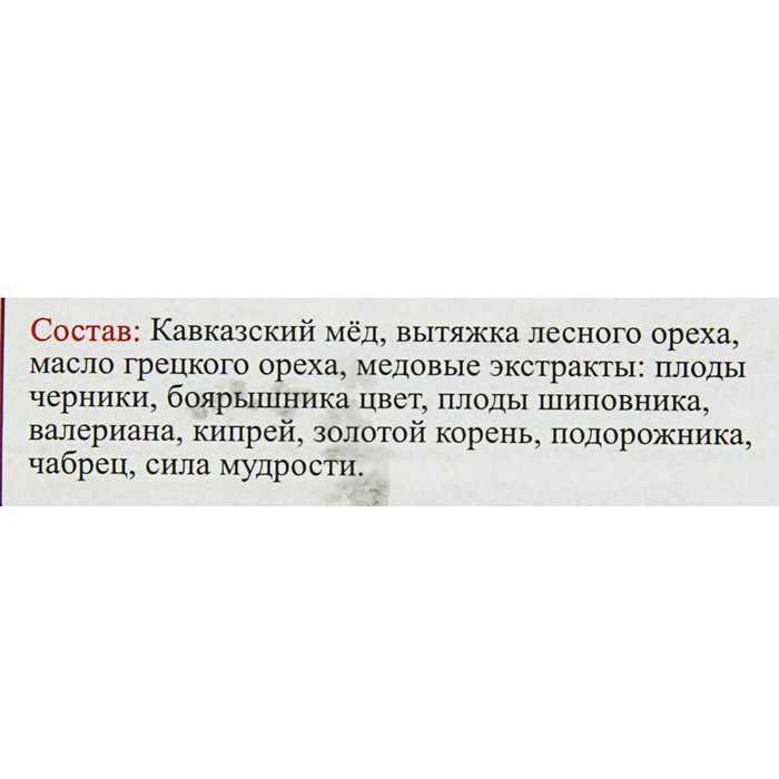 Состав: кавказский мёд, вытяжка лесного ореха, масло грецкого ореха, медовый экстракт: плоды черники, цвет боярышника, плоды шиповника, валериана, кипрей, золотой корень, подорожник, чабрец.