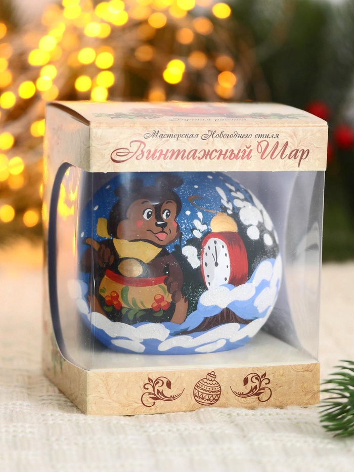 Ёлочный шар «Медведь-сладкоежка», 10 см, стекло, синий с рисунком — это добрый и запоминающийся акцент для новогоднего декора. Украшение с забавным персонажем подходит для ёлки, детской комнаты или подарочной композиции — тёплое решение для тех, кто ценит ностальгию, характер и атмосферу настоящего праздника без излишеств.