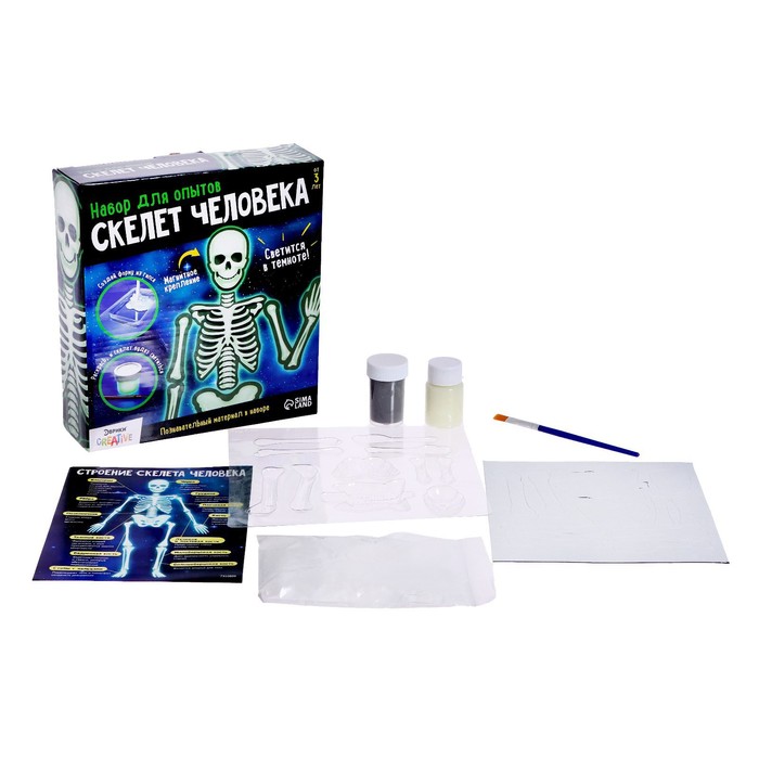 С набором для опытов ребёнок изучит строение тела человека, наглядно увидит, какие есть кости в нашем организме и создаст модель скелета.