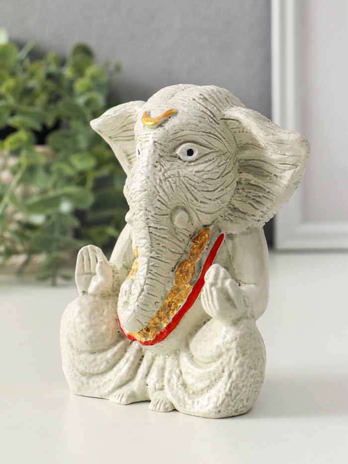 Эта гипсовая статуэтка Ганеши приносит в дом гармонию и мудрость. Образ почитаемого божества, выполненный в технике состаренной росписи, создаёт атмосферу умиротворения и служит сильным духовным символом.