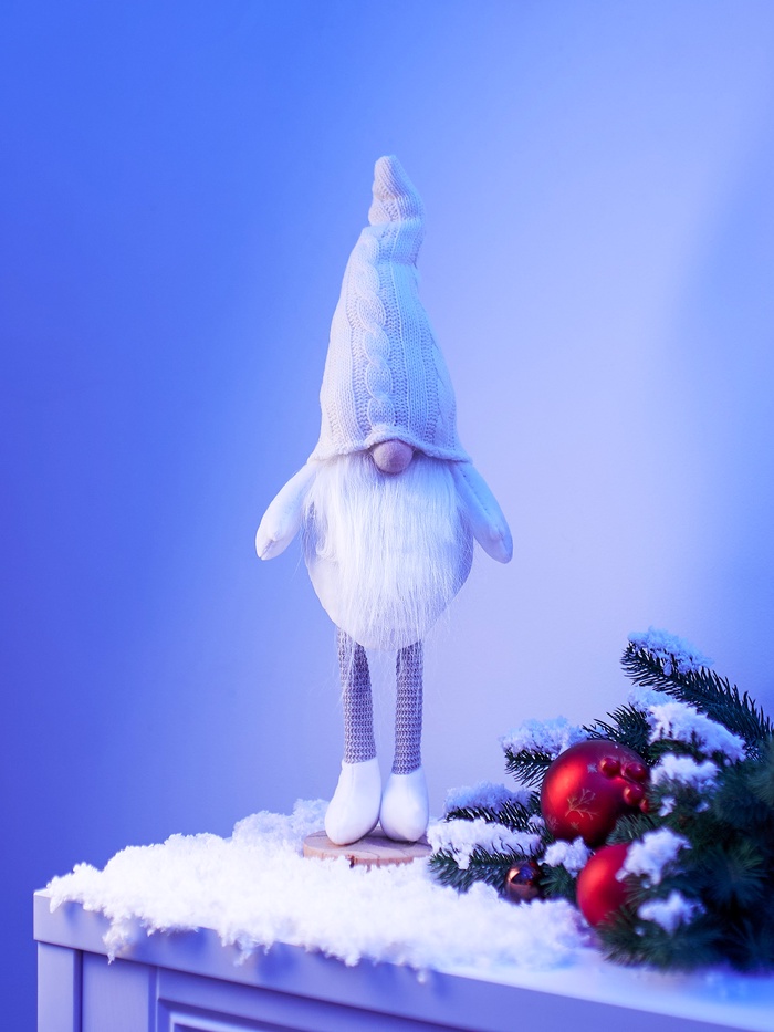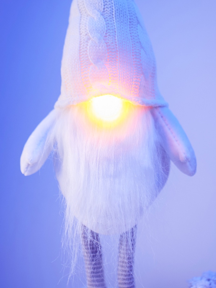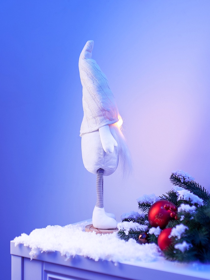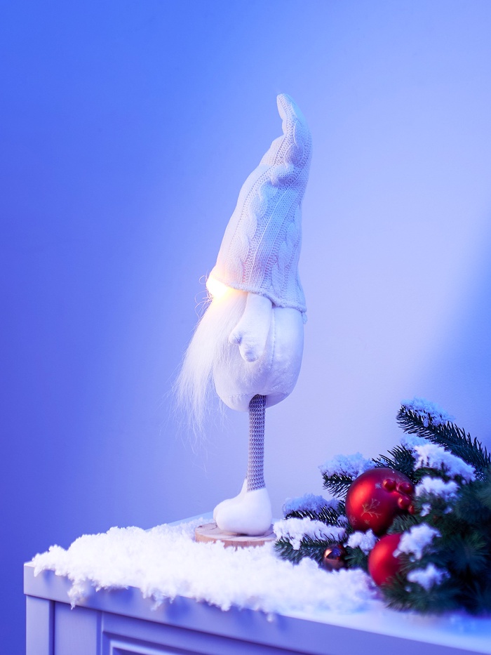 Изящный гном в белом наряде привнесёт в ваш дом атмосферу зимней сказки и уюта. Мягкий текстиль и тёплое белое свечение создают ощущение покоя и гармонии, а компактная высота в 55 см позволяет разместить фигурку на полке, комоде или под ёлкой. Благодаря питанию от батареек AG13, она не нуждается в проводах и розетках, поэтому идеально подходит для украшения любых уголков дома. Постоянное мягкое свечение добавит уюта в вечерние часы и станет стильным элементом декора на праздники или в повседневной обстановке.