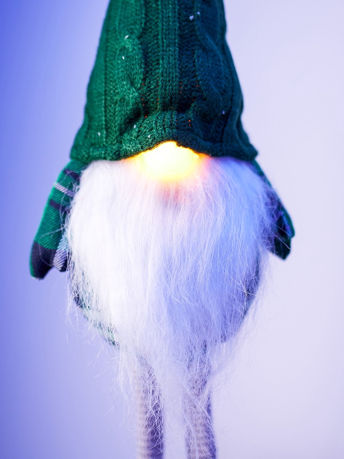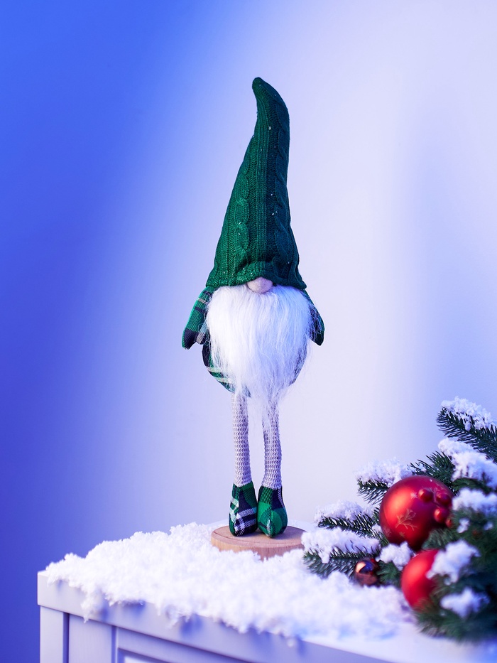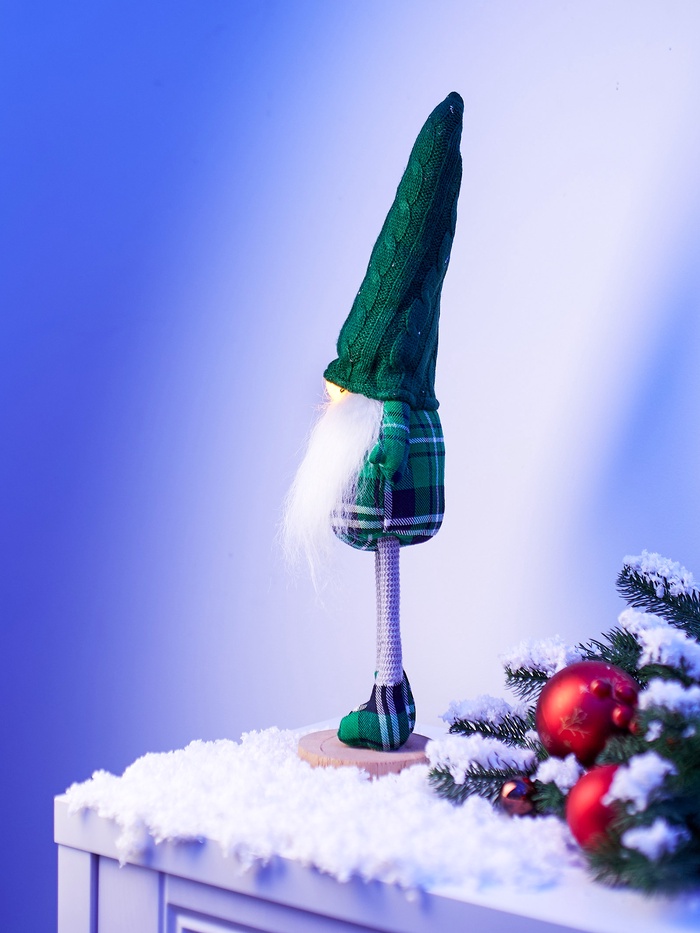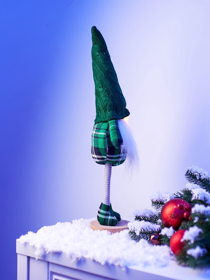 Очаровательный гном в зеленой одежде и с подсветкой — интерьерный акцент, который добавит сказочного настроения и уюта в ваш дом. Изготовленный из текстиля и оснащённый светодиодом, он светится мягким тёплым белым светом, создавая атмосферу комфорта и тепла. Компактная высота и автономное питание позволяют разместить фигуру на комоде, полке или подоконнике, не заботясь о проводах.