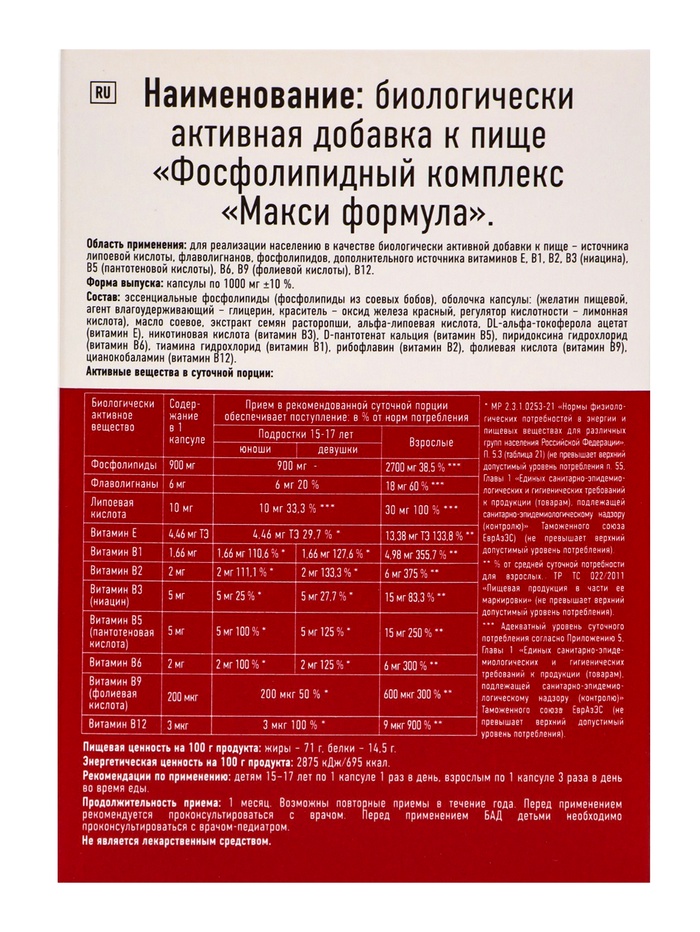 Биологически активная добавка к пище, дополнительный источник фосфолипидов, липоевой кислоты, витамина Е, витамина В1, витамина В2, витамина В3, витамина В5, витамина В6, витамина В9, витамина В12.