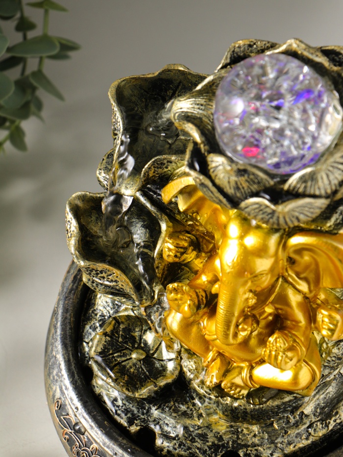 Этот настольный фонтан с Ганешей создаёт в помещении атмосферу гармонии и умиротворения. Мягкая подсветка оживляет композицию, а струящаяся вода приносит в пространство энергию движения, следуя принципам фэншуй для привлечения благополучия.