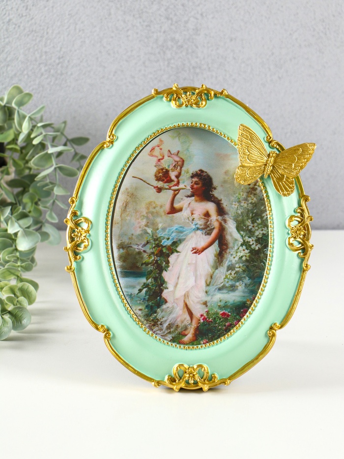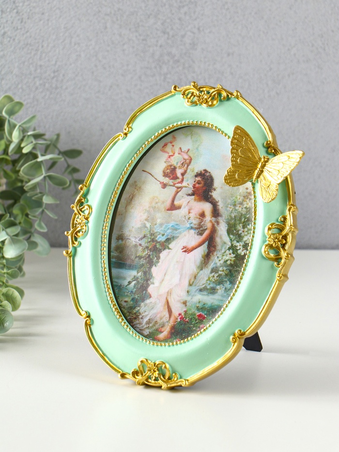 - Стильный дизайн с бабочкой: Золотистая бабочка на бирюзовом фоне символизирует легкость и прекрасные перемены. Такой образ подходит для подарка на 8 Марта, День рождения или просто как знак внимания. Овальное окно для фото добавляет композиции мягкости.